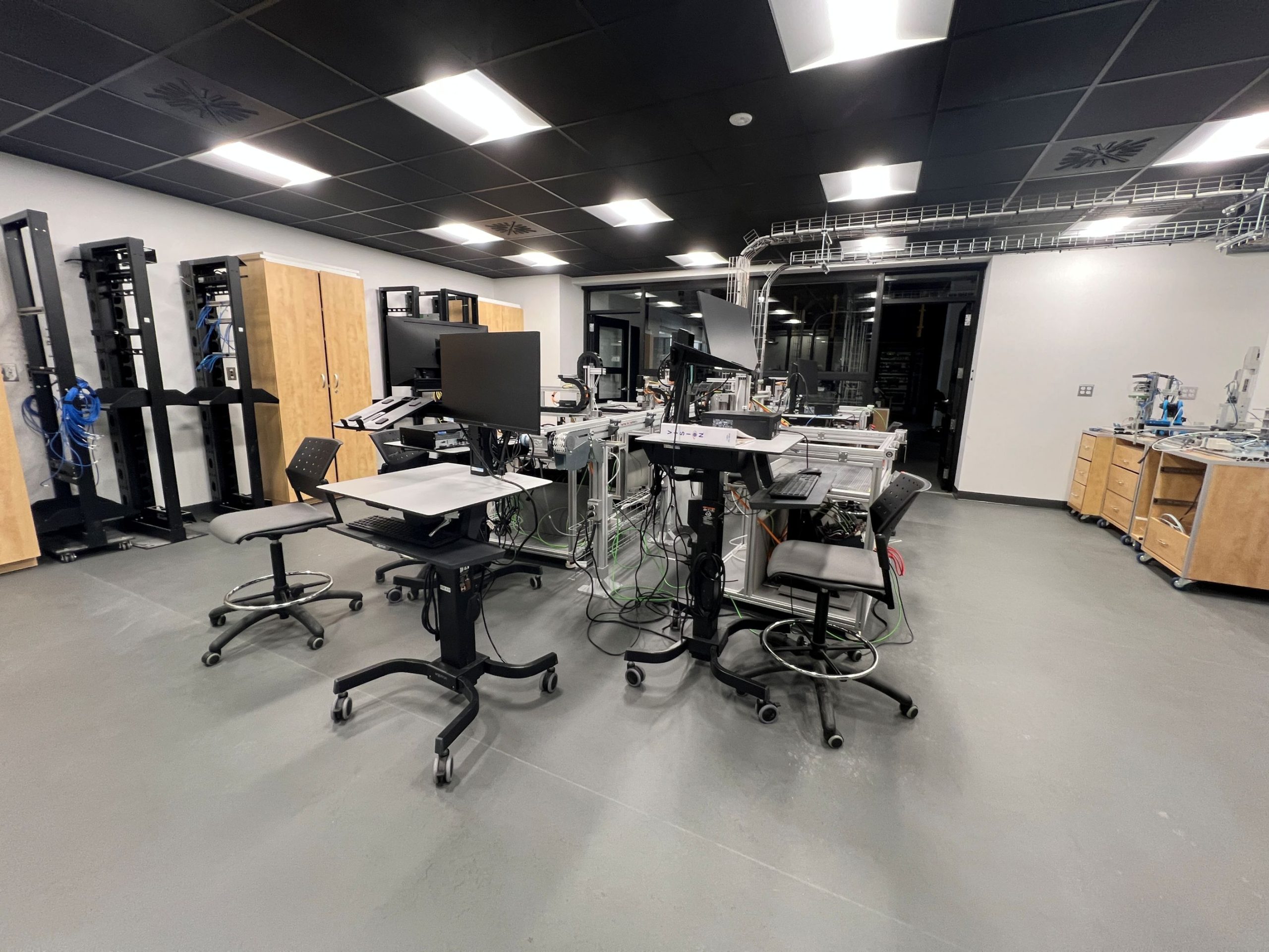 une véritable sous-station électrique industrielle et de l’équipement industriel à la fine pointe : moteurs et démarreurs électroniques 208 volts, 460 volts et 600 volts triphasés, onduleur/redresseur 208V triphasés, procédés industriels réels, robots industriels